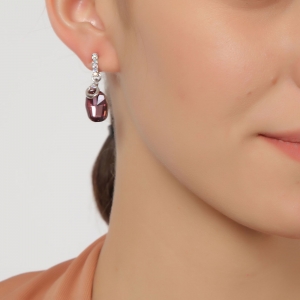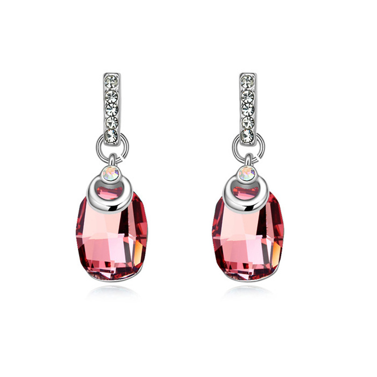 Hermoso aretes, en baño de oro blanco de 18 quilates, exquisito diseño, con cristal rosa corte cushion, detalles en plateado e incrustación de cristales blancos. Fabricado en una estructura de aleación de platino con rodio sin níquel.