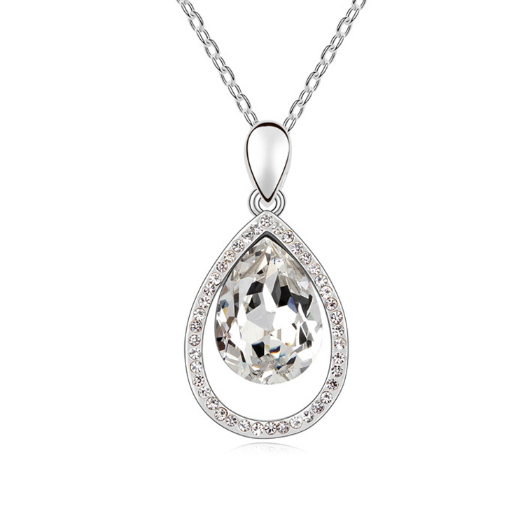 Elegante Dije en baño de oro blanco de 18 quilates, diseño de gota con incrustación de cristales en color blanco. Cuenta con una cadena de 40 cm, con extención de 5 cm. Fabricado en una estructura de aleación de platino con rodio sin níquel. 1. joyería Hipoalergénica. 2. Incluye cajita de joyería. 3. Garantía de 30 días por defectos de fabrica.