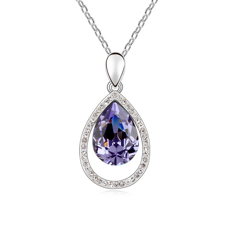 Elegante Dije en baño de oro blanco de 18 quilates, diseño de gota con incrustación de cristales en color blanco y morado.