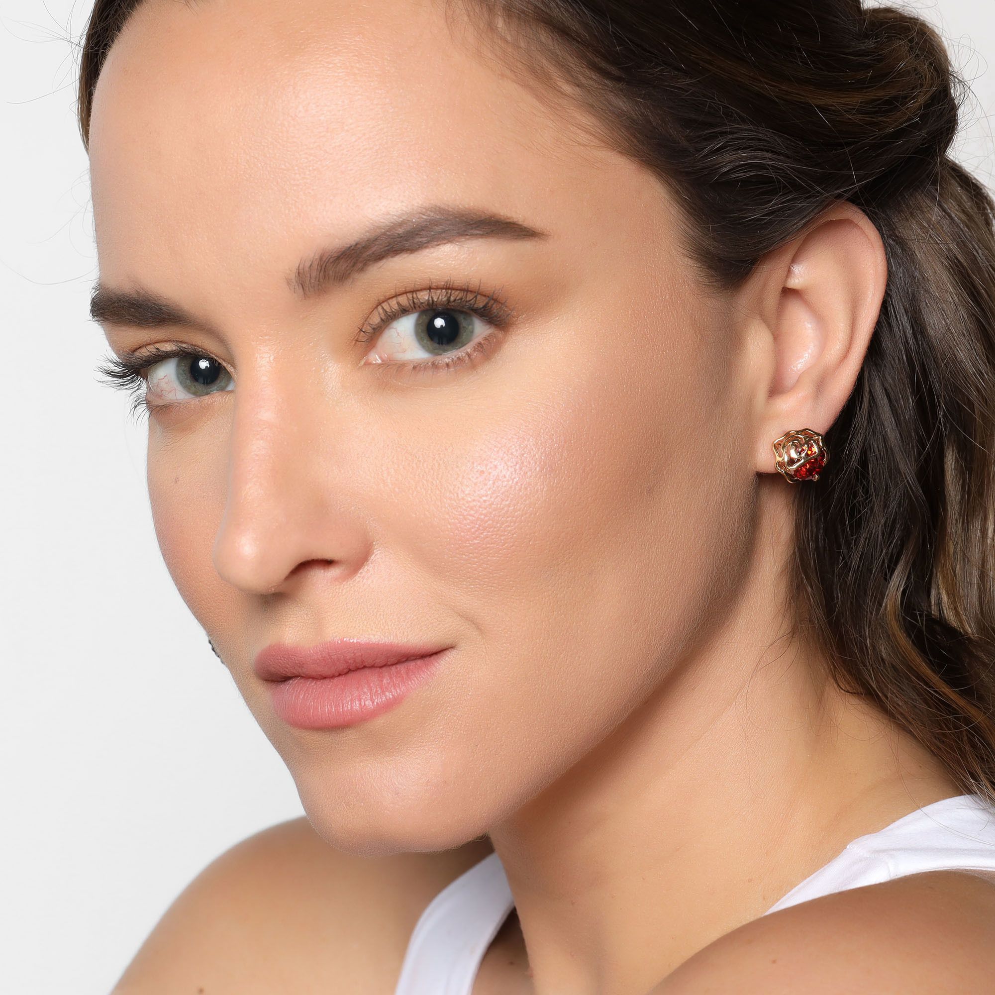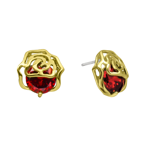 Elegantes aretes, en baño de oro amarillo de 18 quilates, diseño de flor, con incrustación de cristal en color rojo corte brillante.