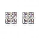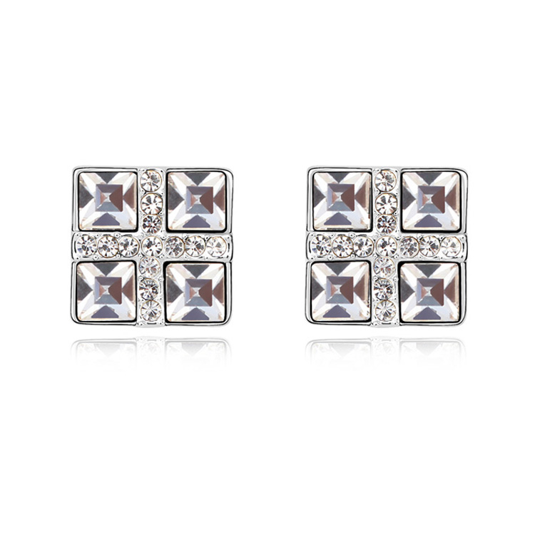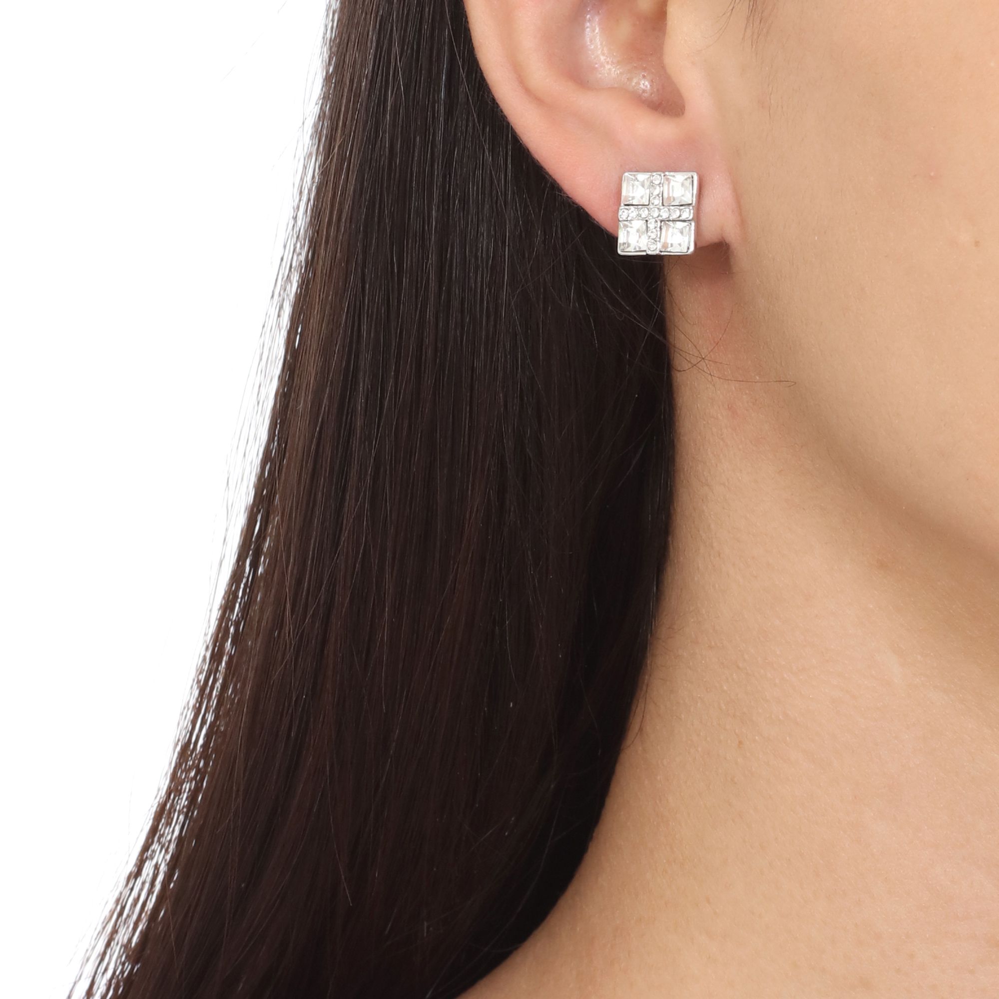 Elegantes aretes, en baño de oro blanco de 18 quilates, diseño de cuadro, con cristales blancos corte princesa e incrustación de cristales blancos.