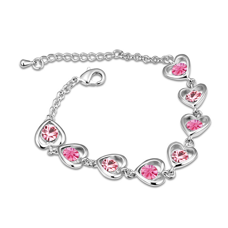 Brazalete en baño de oro blanco de 18 quilates, diseño de corazones, con incrustaciones de cristales en color rosa.