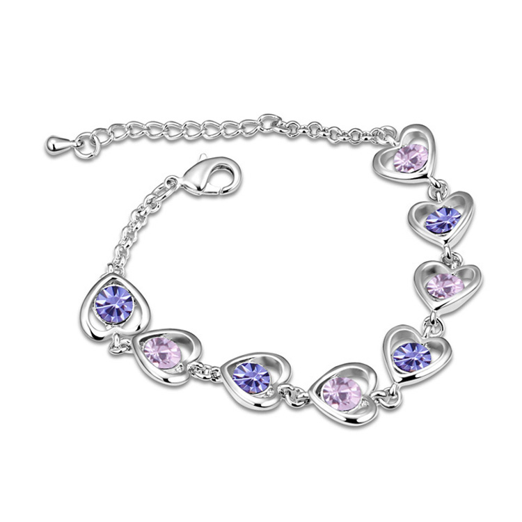 Brazalete en baño de oro blanco de 18 quilates, diseño de corazones, con incrustaciones de cristales en color lila y morado.