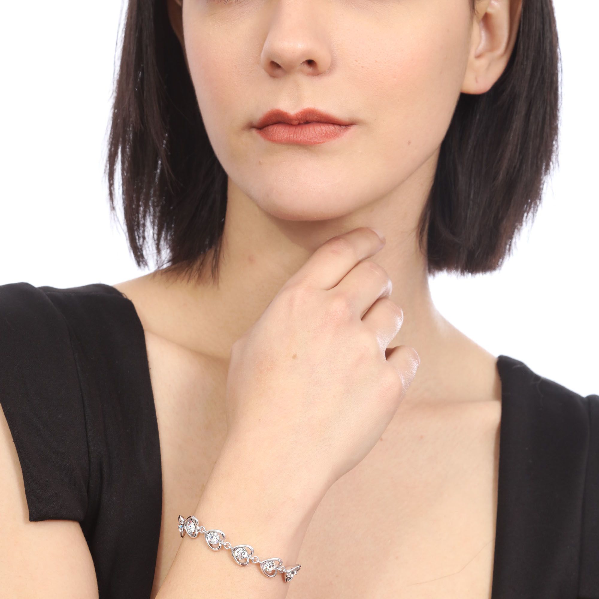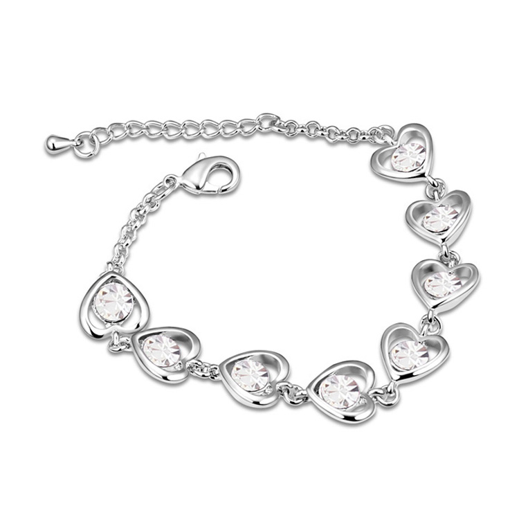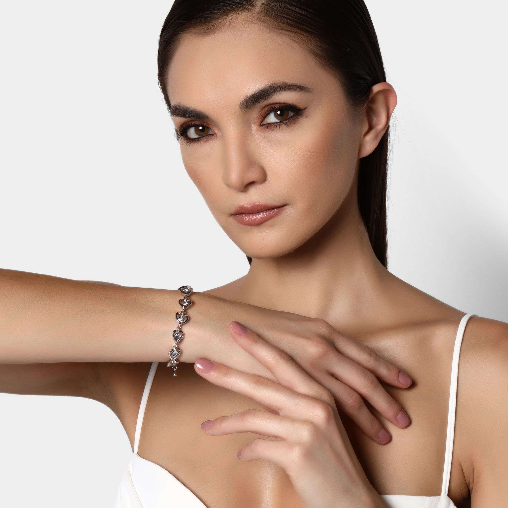 Brazalete en baño de oro blanco de 18 quilates, diseño de corazones, con incrustaciones de cristales en color blanco.
