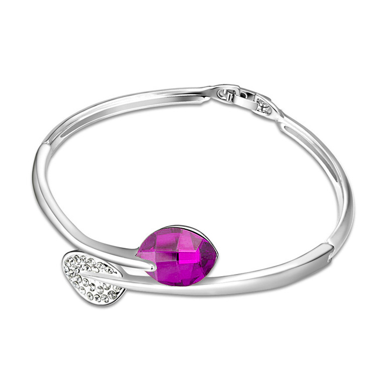 Brazalete en baño de oro blanco de 18 quilates, elegante diseño de hojas, con cristal violeta corte marquesa e incrustaciones de cristales blancos.