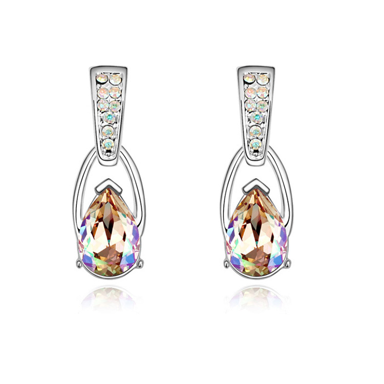 Hermosos aretes, en baño de oro blanco de 18 quilates, diseño de gota, con cristal tornasol corte pera e incrustación de cristales blancos.