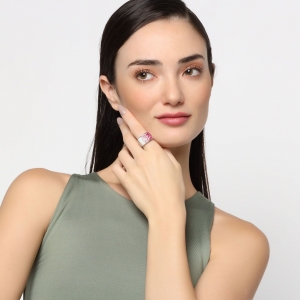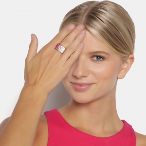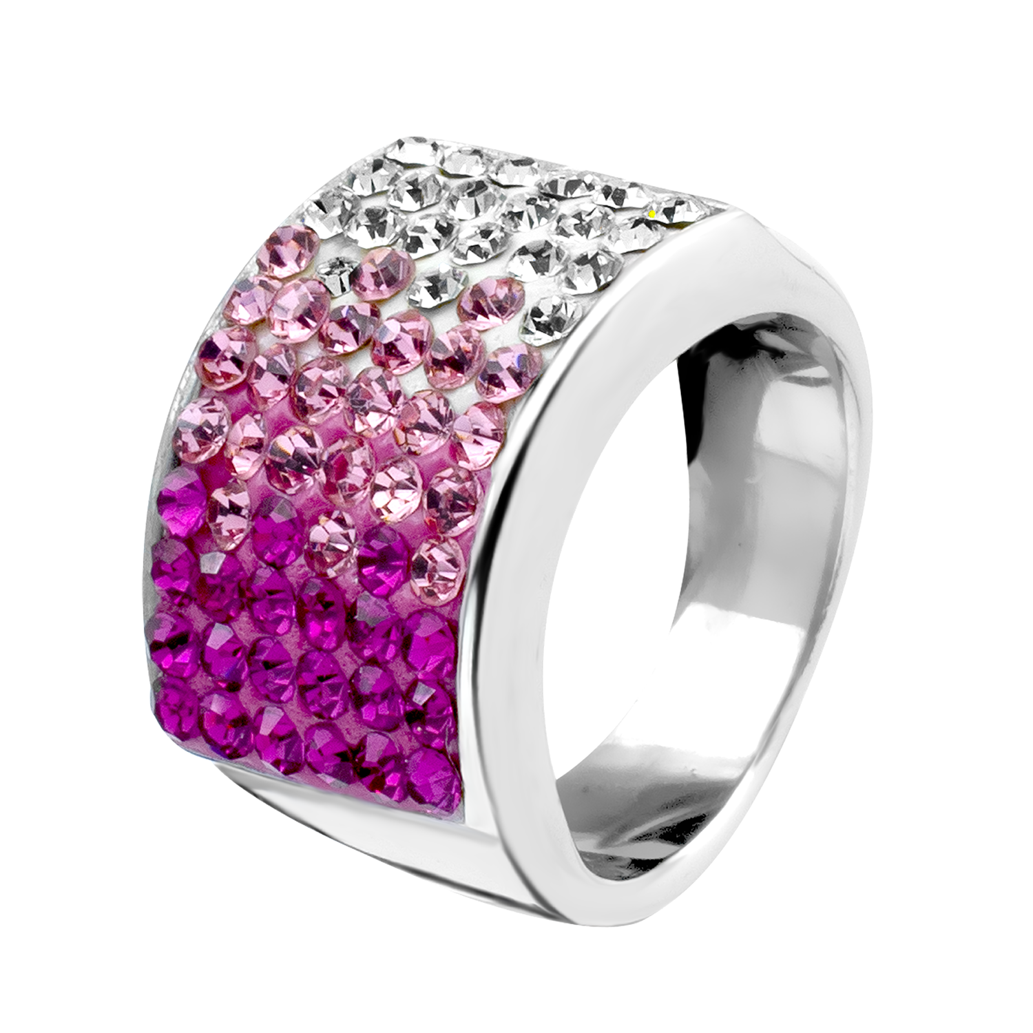 Precioso anillo en baño de oro blanco de 18 quilates, lindo diseño, con incrustaciones de cristales en color blanco, rosa y fucsia.