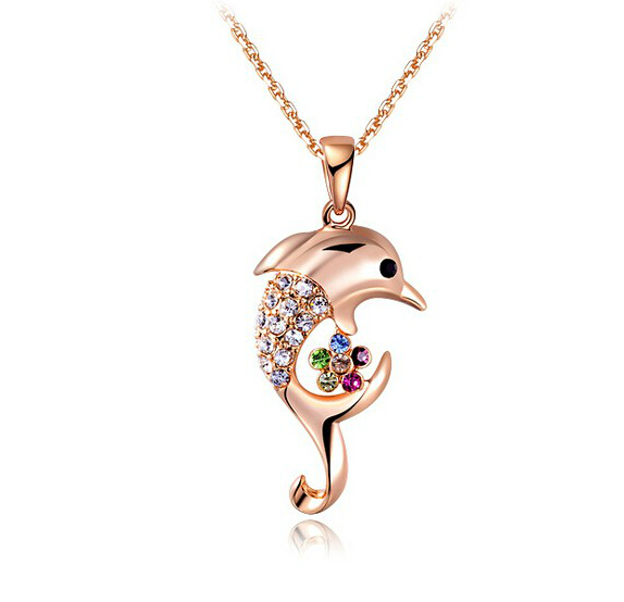 Lindo Dije en baño de oro rosa de 18 quilates, diseño de delfin con incrustación de cristales en colores. Fabricado en una estructura de aleación de platino con rodio sin níquel 1. joyería Hipoalergénica. 2. Incluye cajita de joyería. 3. Garantía de 30 días por defectos de fabrica.