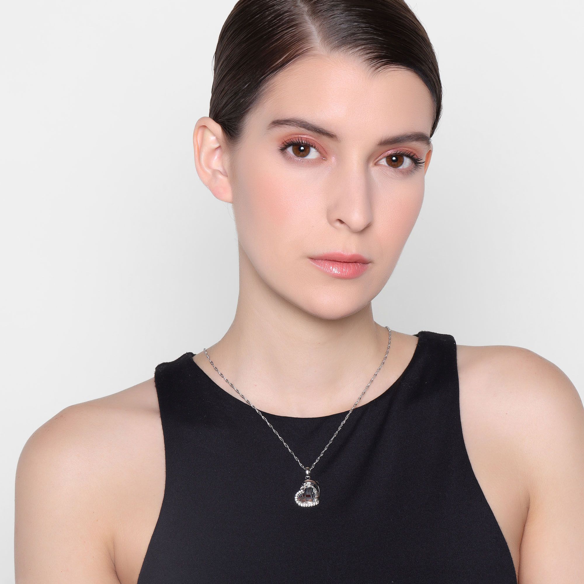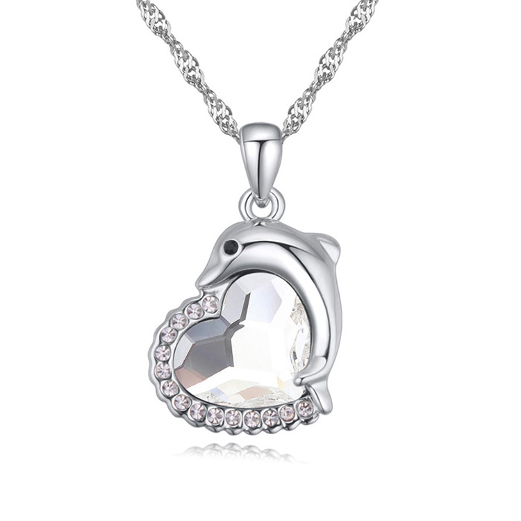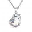 Lindo Dije en baño de oro blanco de 18 quilates, diseño de corazón y delfin con incrustación de cristales en color blanco.