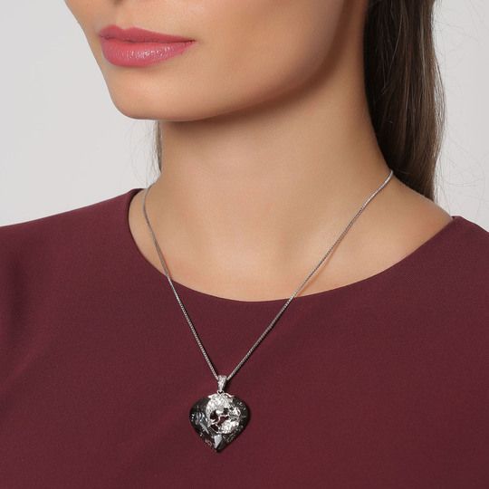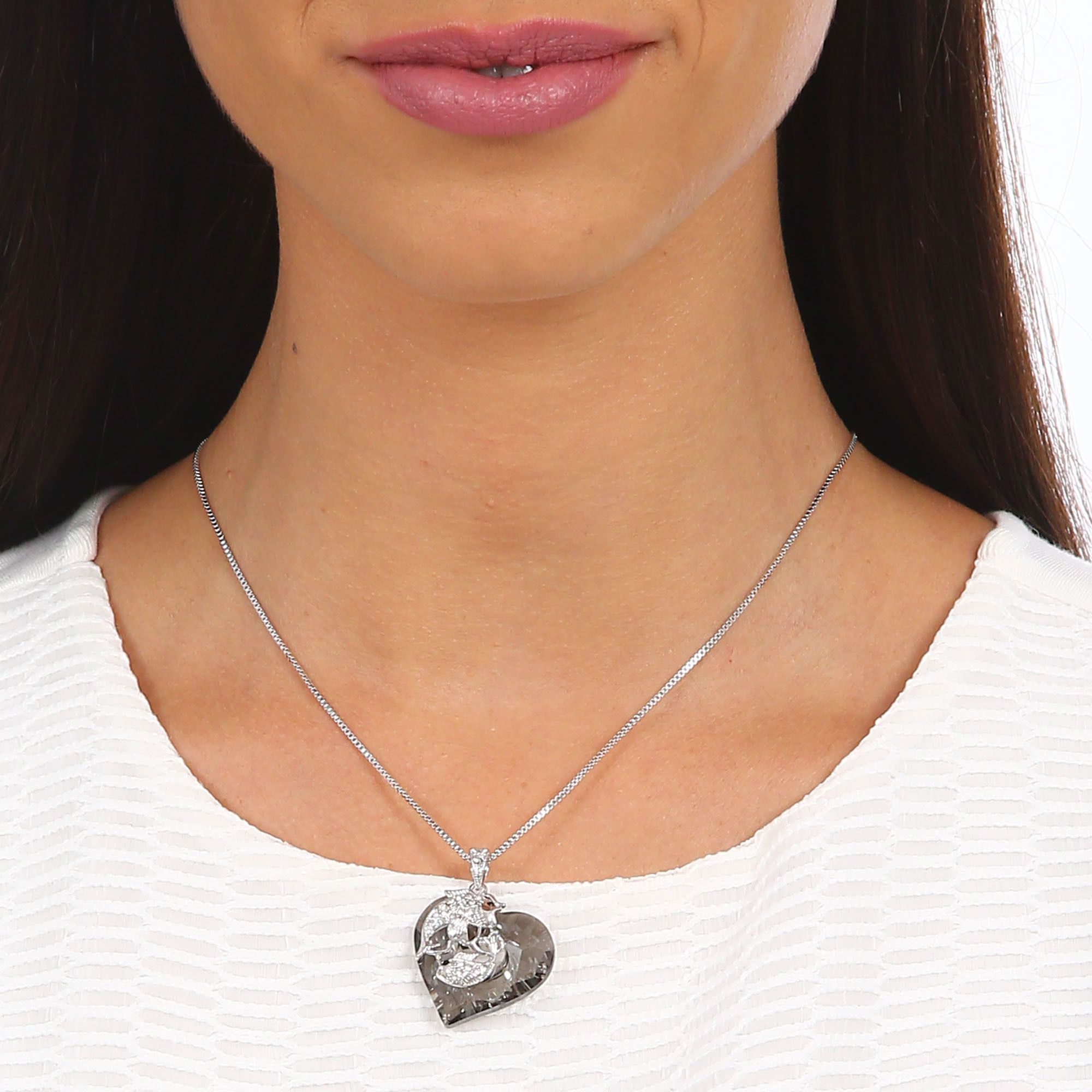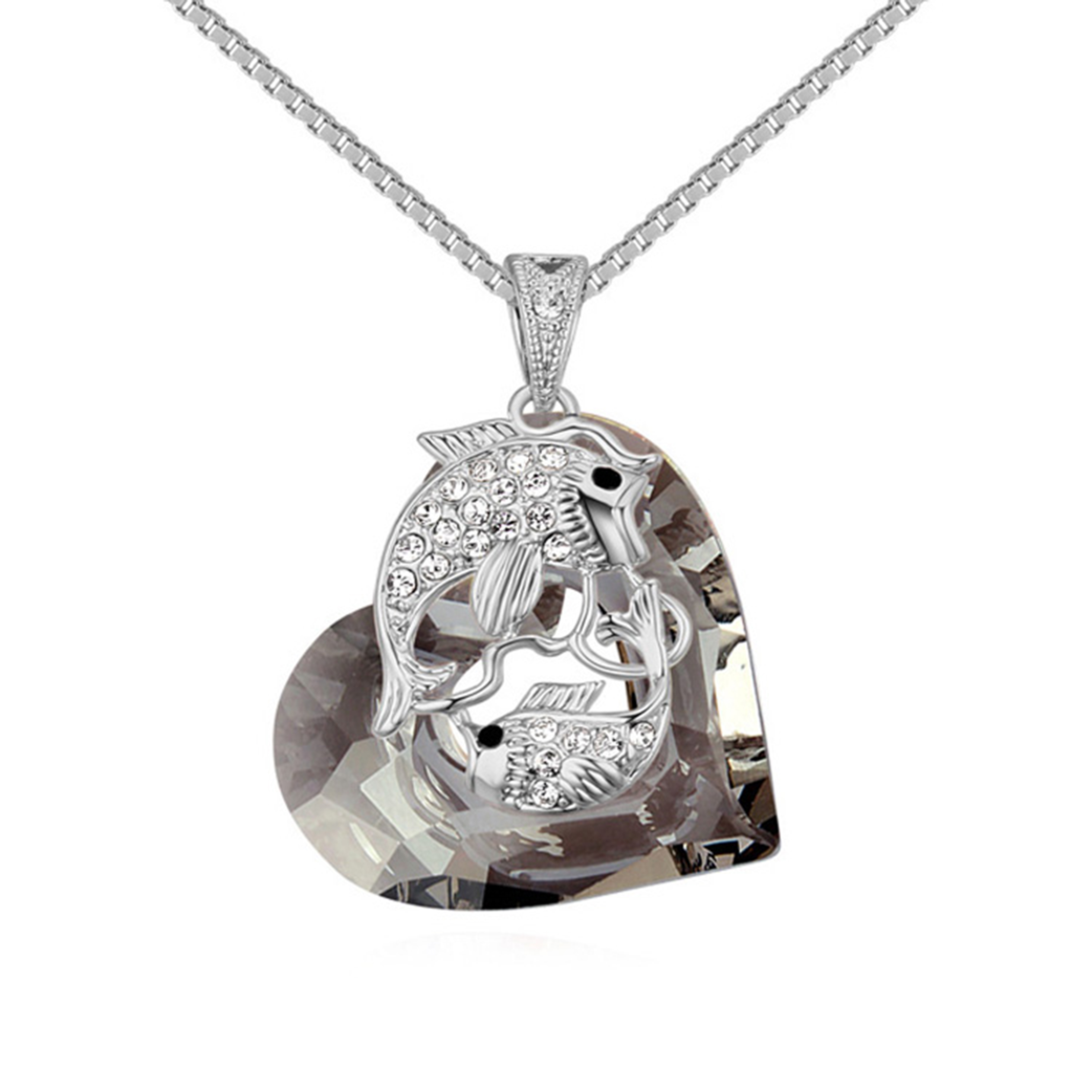 Lindo Dije en baño de oro blanco de 18 quilates, diseño de corazón con pecesitos entrelazados, con incrustación de cristales en color blanco y oxford. Fabricado en una estructura de aleación de platino con rodio sin níquel. 1. joyería Hipoalergénica. 2. Incluye cajita de joyería. 3. Garantía de 30 días por defectos de fabrica.