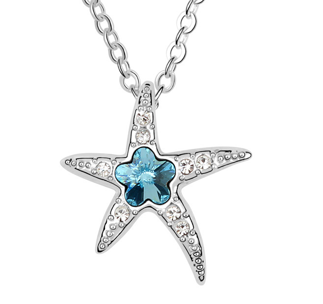 Dije en baño de oro blanco de 18 quilates, diseño de estrella con incrustación de cristales en color azul y blanco.