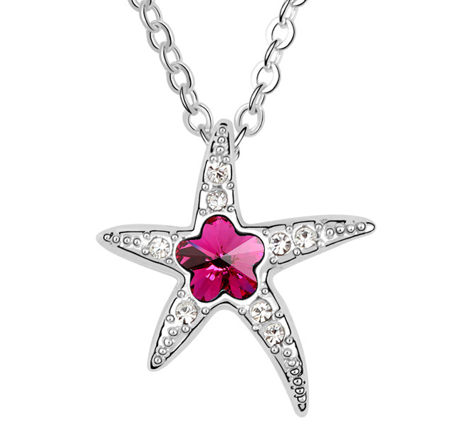 Dije en baño de oro blanco de 18 quilates, diseño de estrella con incrustación de cristales en color blanco y fiusha.
