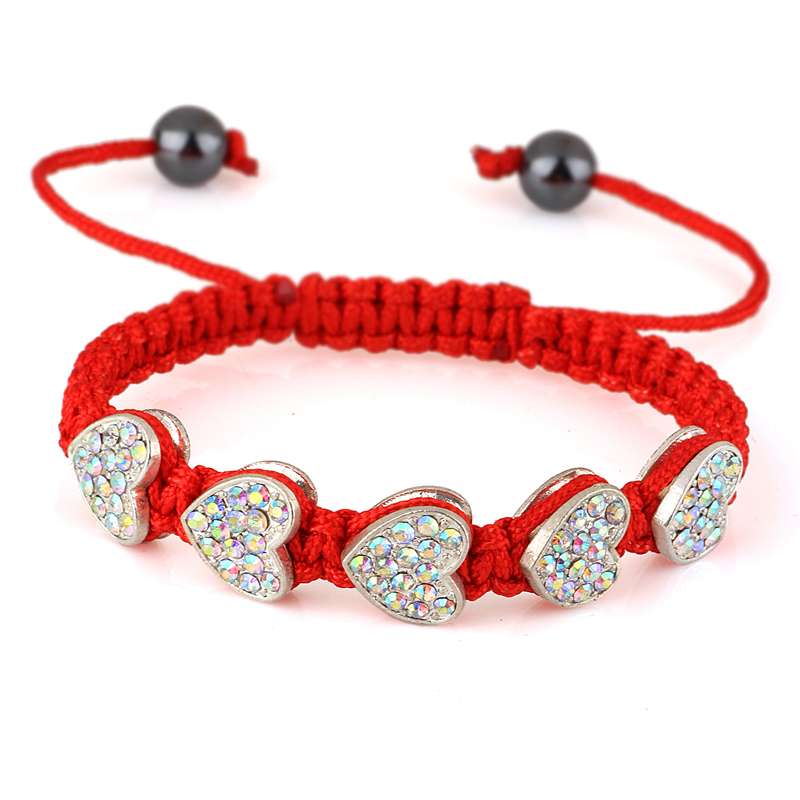 Pulsera con detalles en baño de oro blanco de 18 quilates, con correa trenzada de hilo reforzado color rojo, beads en forma de corazón, incrustaciones de cristales tornasol y cuentas grises.
