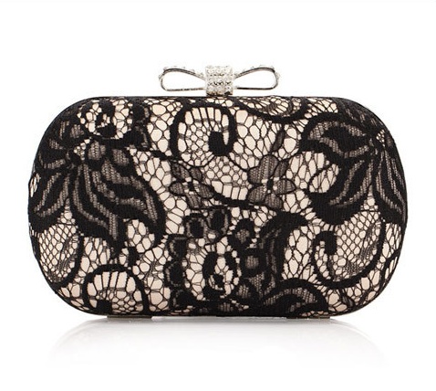 Bolsa de noche, en color blanco y encaje negro, con diseño rectangular, hermoso detalle de broche en forma de moño, en baño de oro blanco de 18 quilates e incrustaciones de cristales blancos.