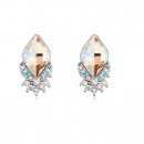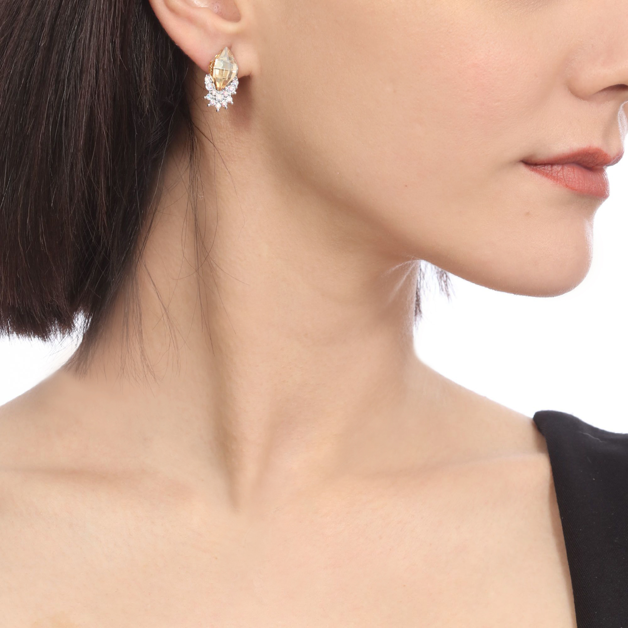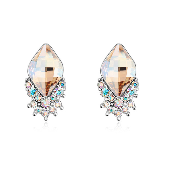 Hermosos aretes, en baño de oro blanco de 18 quilates, diseño de rombo, con cristal ámbar corte losange e incrustación de cristales tornasol. Fabricado en una estructura de aleación de platino con rodio sin níquel.