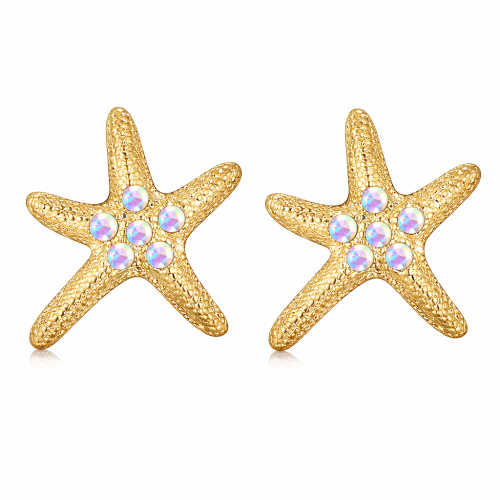 Aretes en baño de oro amarillo de 18 quilates, diseño de estrella, con incrustación de cristales en color tornasol. Fabricado en una estructura de aleación de platino con rodio sin níquel.