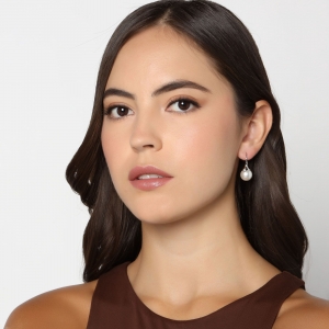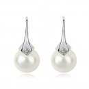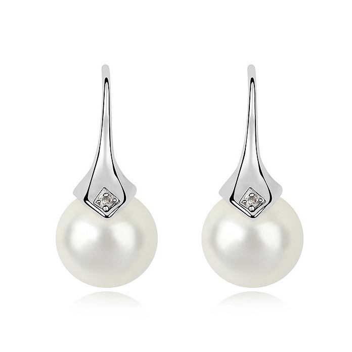 Hermosos aretes, en baño de oro blanco de 18 quilates, elegante diseño, con perla blanca e incrustación de cristal blanco. Fabricado en una estructura de aleación de platino con rodio sin níquel.