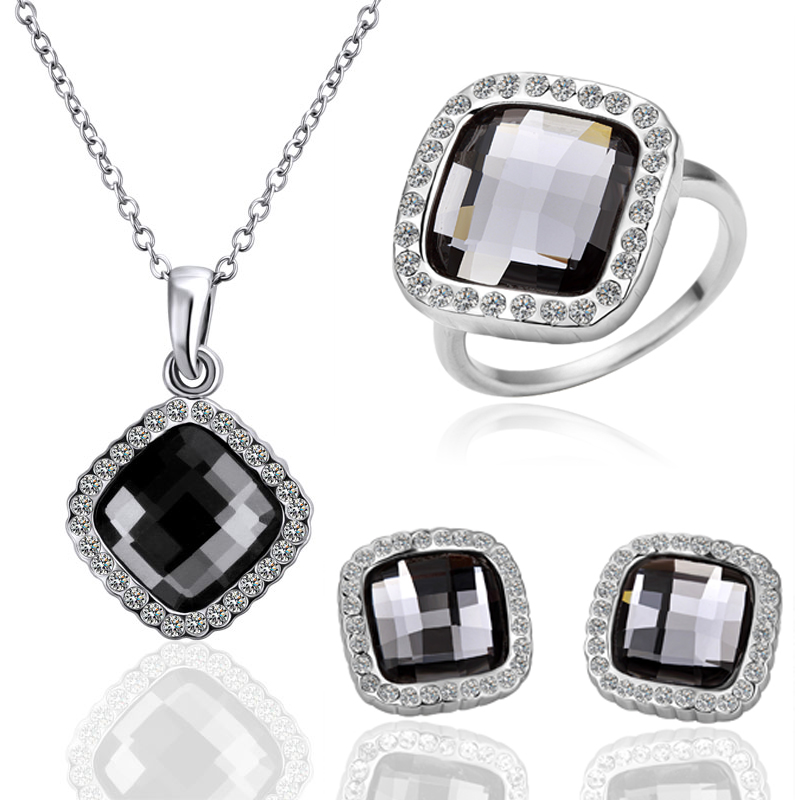 Juego de aretes, anillo y dije en baño de oro blanco de 18 quilates, diseño de cristal cuadrado con incrustación de cristales en color humo y blanco.