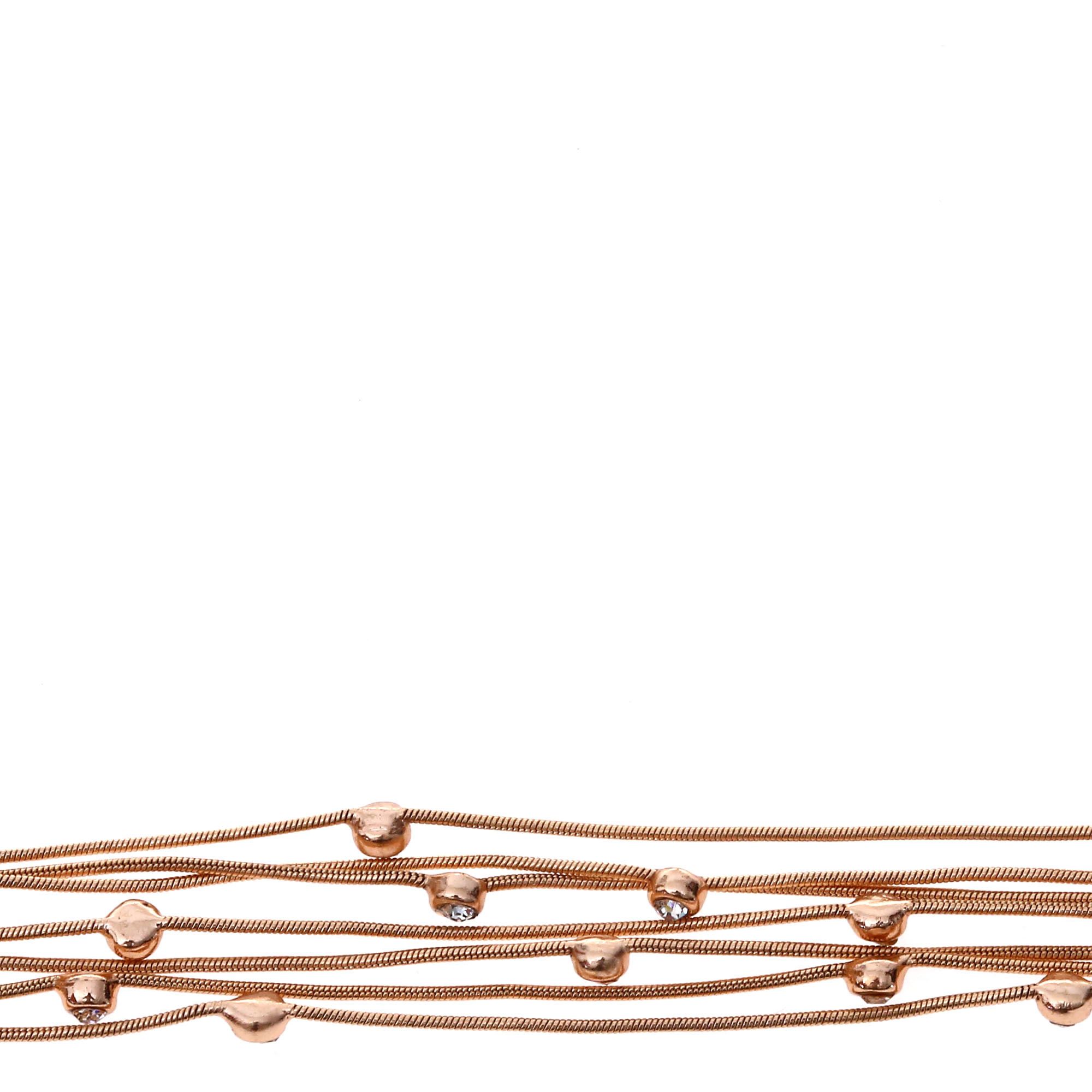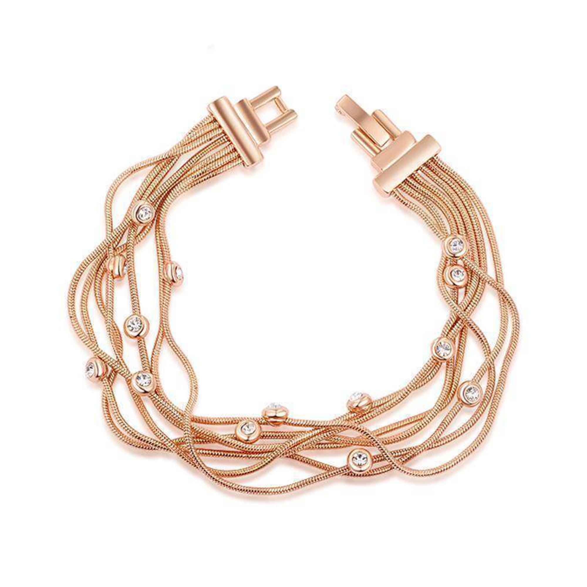 Elegante brazalete, en baño de oro rosa de 18 quilates, original diseño de tiras múltiples, con incrustaciones de cristales en color blanco y broche de seguridad.