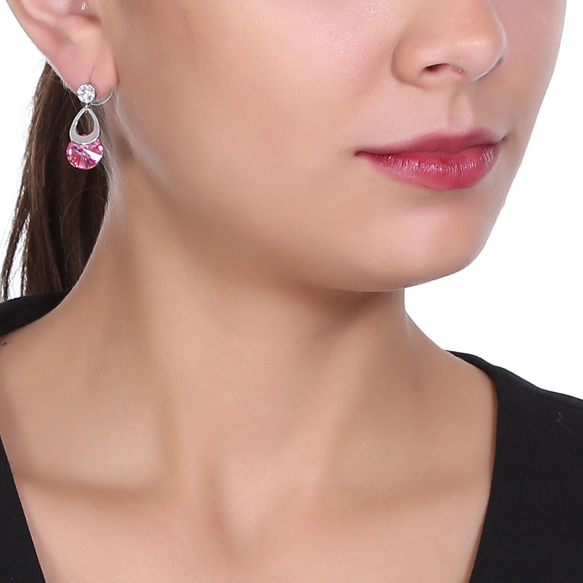 Hermosos aretes, en baño de oro blanco de 18 quilates, diseño de péndulo, con cristales en color blanco y rosa corte brillante. Fabricado en una estructura de aleación de platino con rodio sin níquel