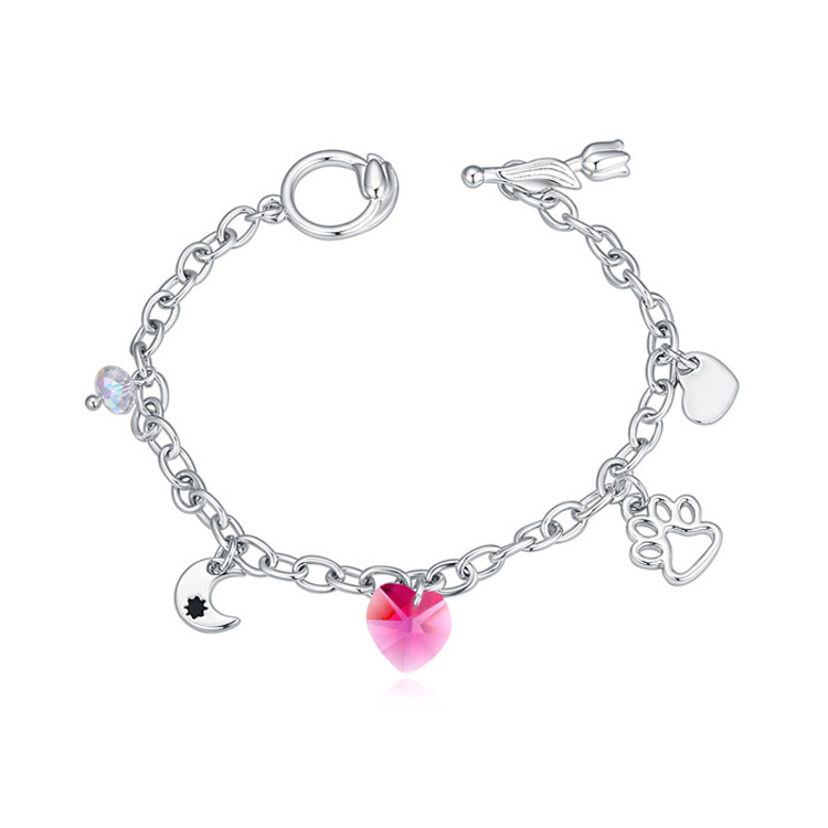 Pulsera en baño de oro blanco de 18 quilates, lindo diseño, con corazón de cristal rosa, dijes de estrella, luna y huella, cristal blanco y broche de palanca en forma de flores.