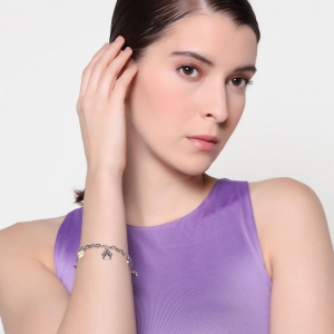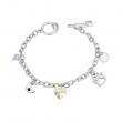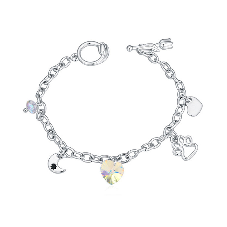 Pulsera en baño de oro blanco de 18 quilates, lindo diseño, con corazón de cristal tornasol, dijes de estrella, luna y huella, cristal blanco y broche de palanca en forma de flores.