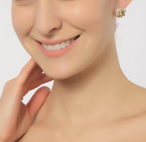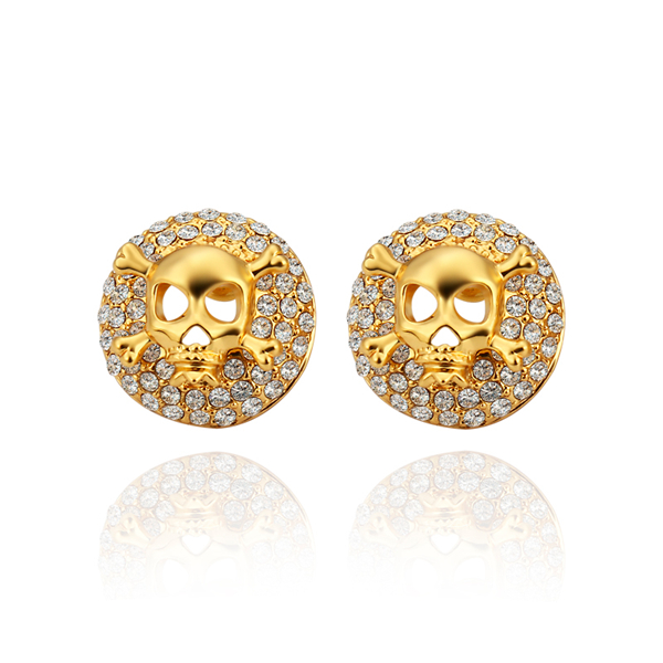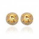 Aretes en baño de oro amarillo de 18 quilates, diseño de círculo, con calavera en relieve e incrustación de cristales en color blanco. Fabricado en una estructura de aleación de platino con rodio sin níquel.