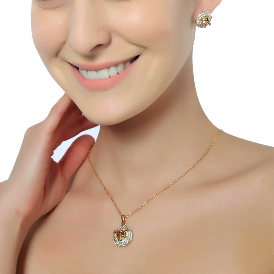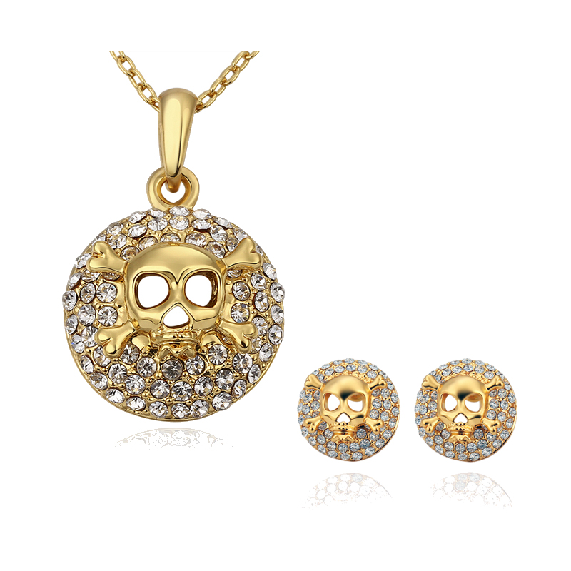 Lindo set de aretes y dije con cadena en baño de oro amarillo de 18 quilates, diseño de calavera en relieve e incrustaciones de cristales en color blanco. Fabricado en una estructura de aleación de platino con rodio sin níquel.
