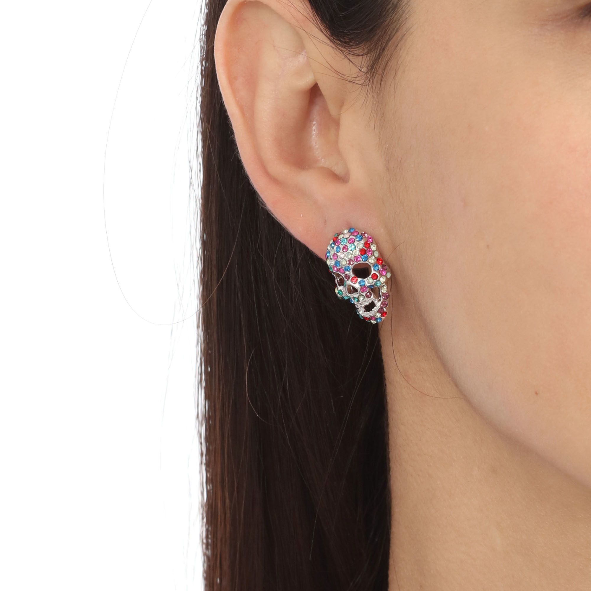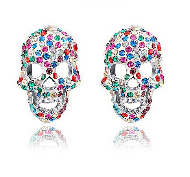 Aretes en baño de oro blanco de 18 quilates, diseño de calavera, con incrustación de cristales en colores. Fabricado en una estructura de aleación de platino con rodio sin níquel.