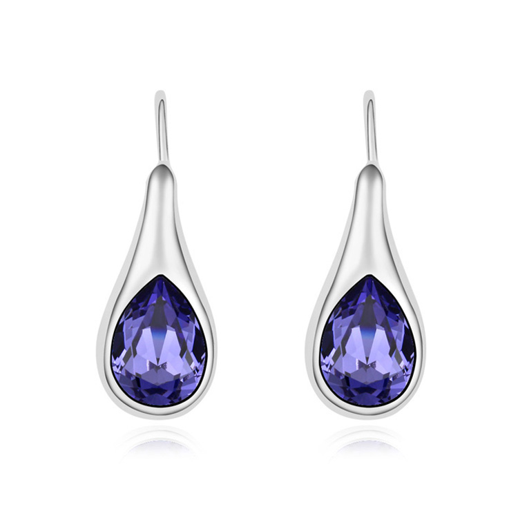Aretes en baño de oro blanco de 18 quilates, diseño de gota, con cristal en color morado corte pera.