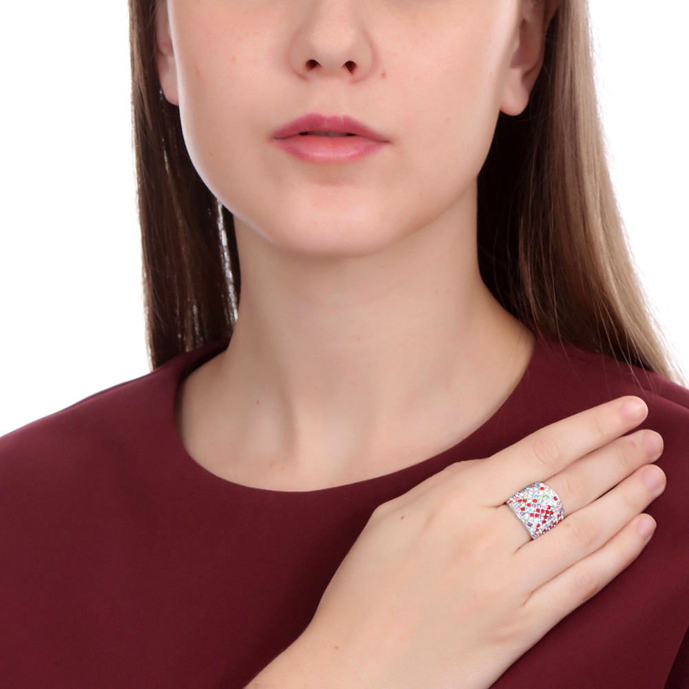 Delicado anillo en baño de oro blanco de 18 quilates, hermosos diseño, con incrustación de cristales en colores.