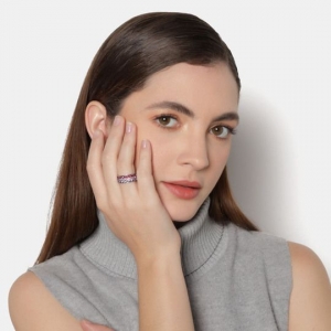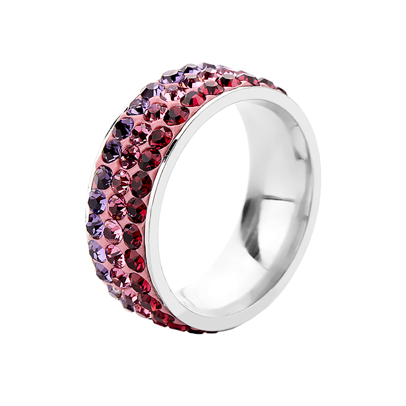 Anillo en acero inoxidable, diseño estilo degradado, con fondo morado e incrustaciones de cristales en color morado, rosa y lavanda.