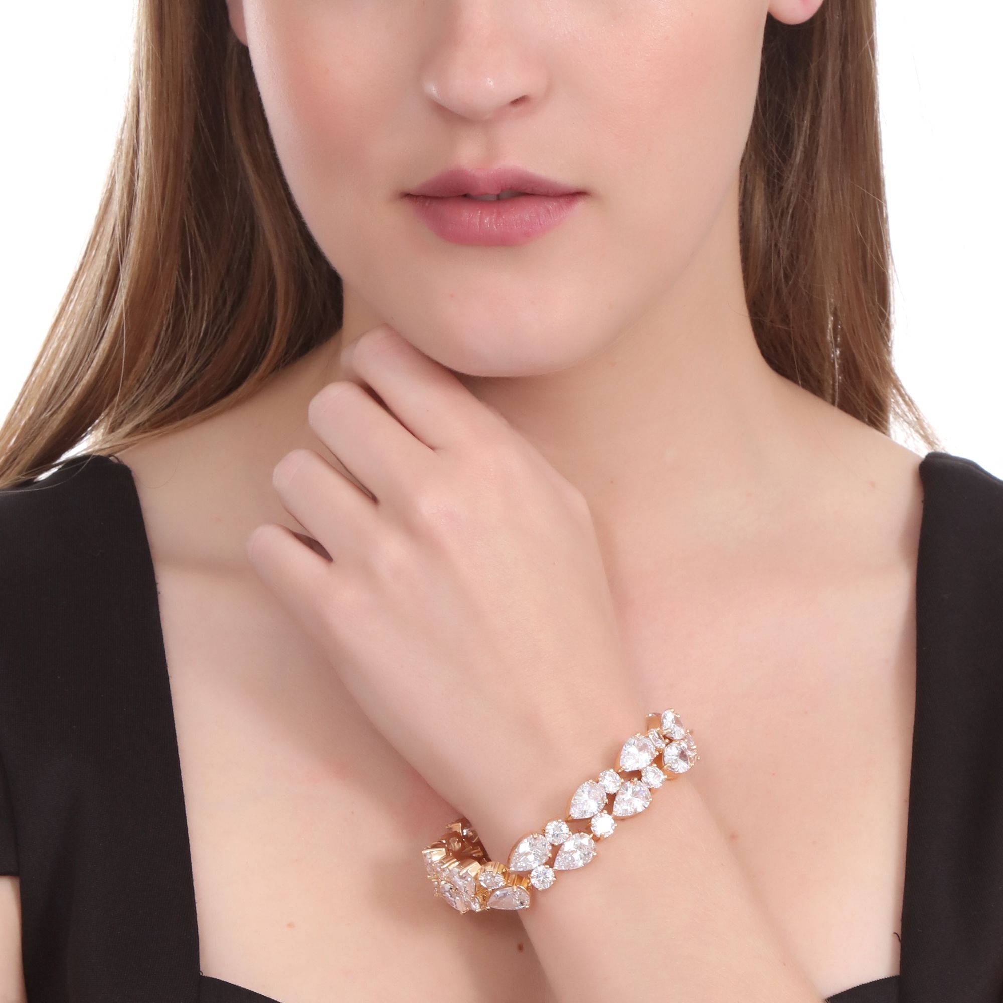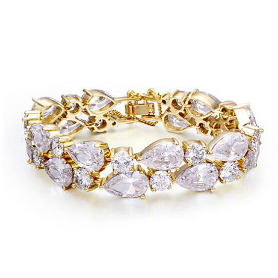 Exquisito brazalete, en baño de oro amarillo de 18 quilates, diseño de gotas engarzadas, con incrustaciones de cristales corte pera en color blanco.