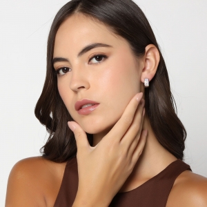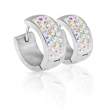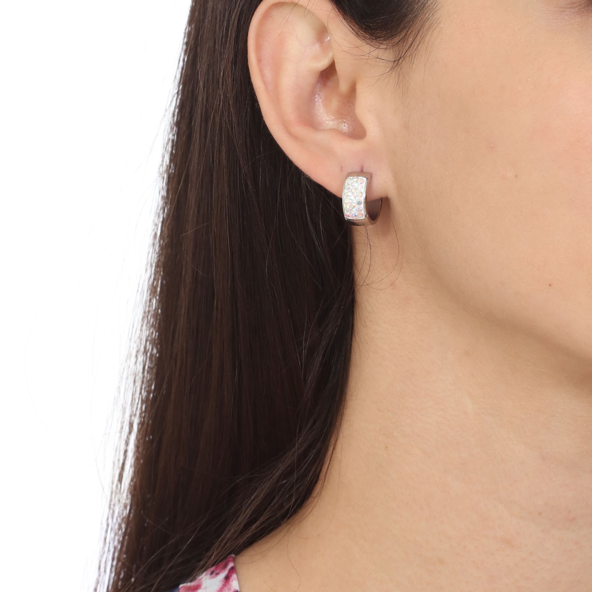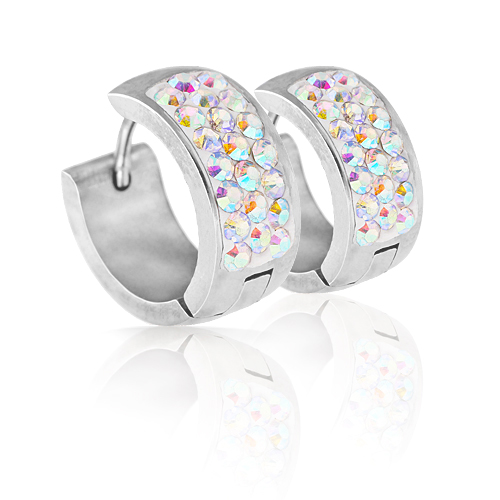 Arracadas en acero inoxidable, con fondo blanco e incrustación de cristales en color tornasol.