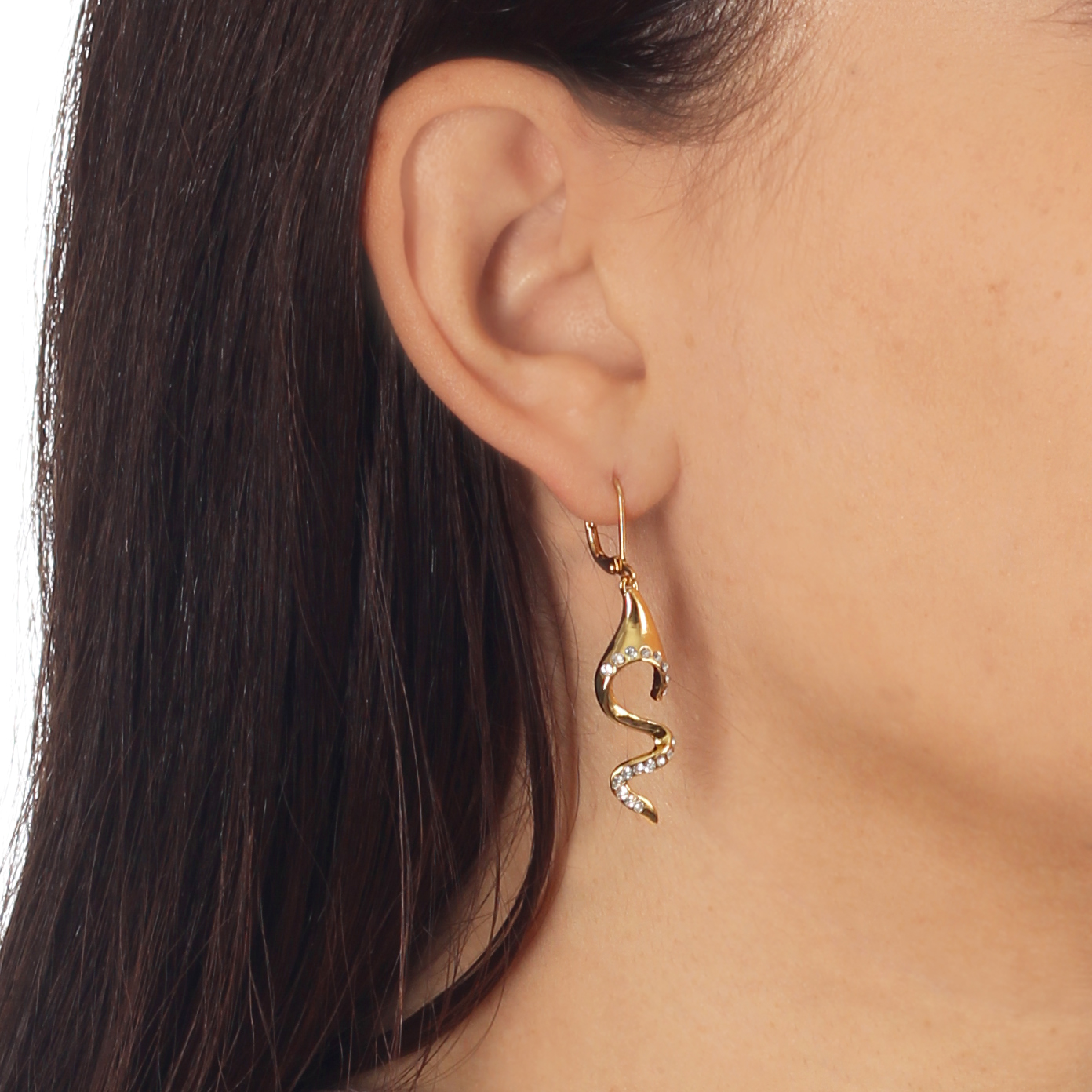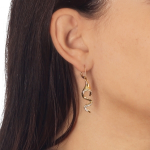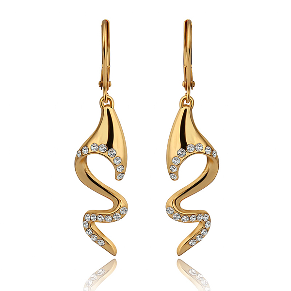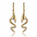 Elegantes aretes, en baño de oro amarillo de 18 quilates, diseño de ondas, con incrustación de cristales en color blanco.