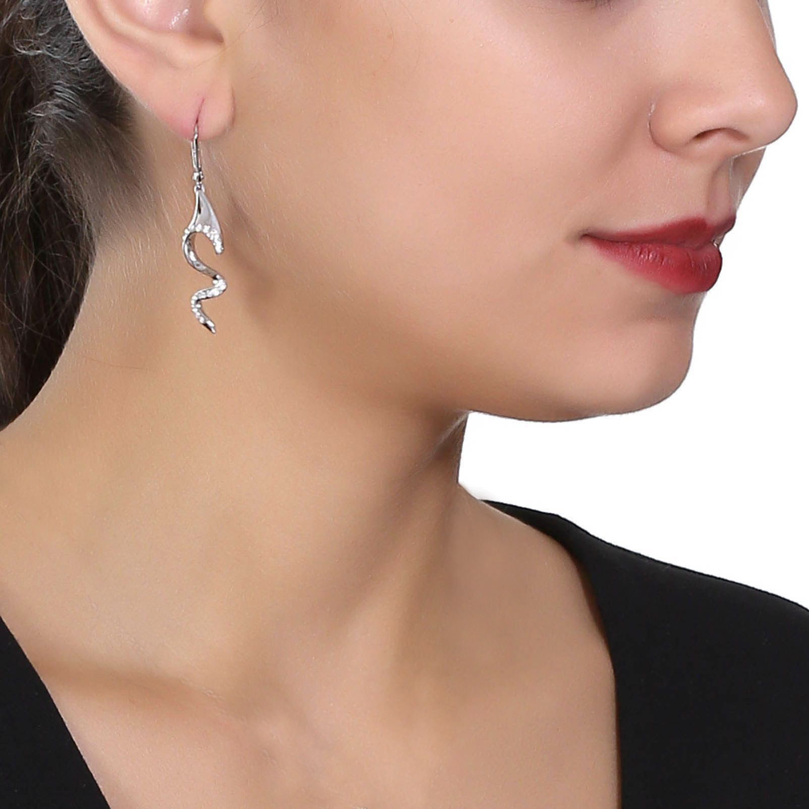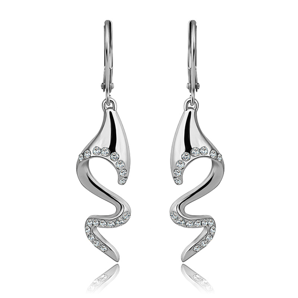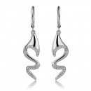 Elegantes aretes, en baño de oro blanco de 18 quilates, diseño de ondas, con incrustación de cristales en color blanco.