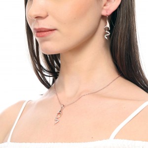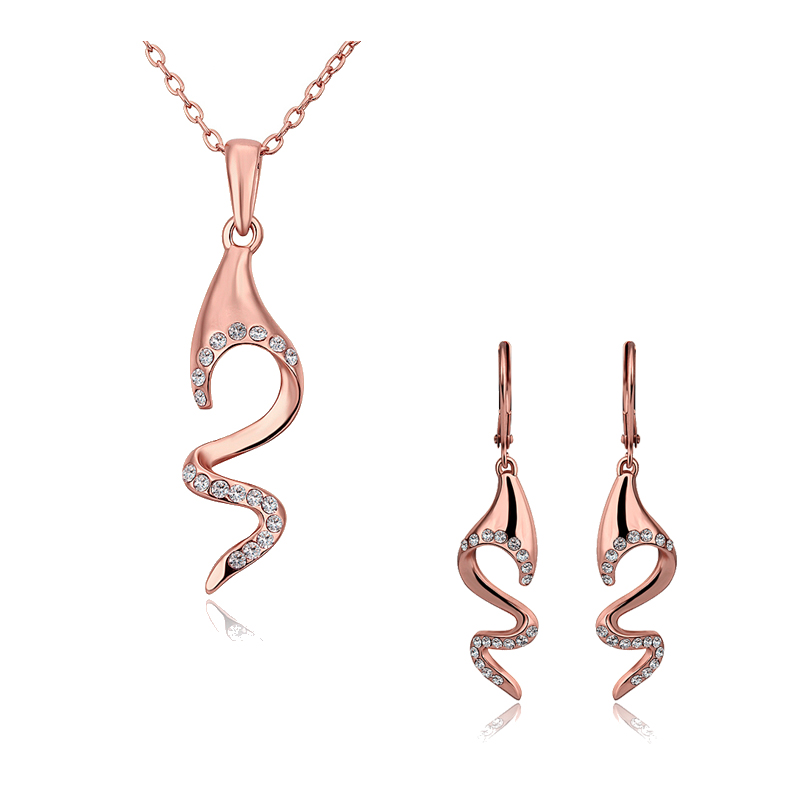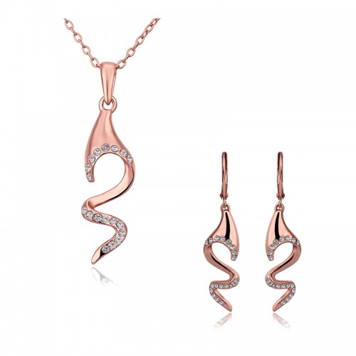Elegante set de aretes y dije con cadena, en baño de oro rosa de 18 quilates, diseño de ondas con incrustación de cristales en color blanco.