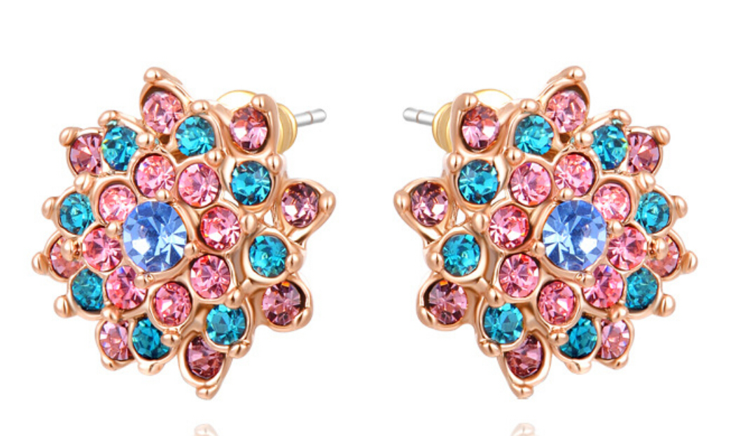 Hermosos aretes, en baño de oro rosa de 18 quilates, diseño de flor, con incrustación de cristales en tonos azules y rosas.