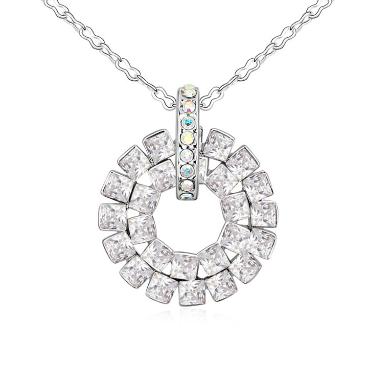 Elegante dije en baño de oro blanco de 18 quilates, diseño de circulo con incrustaciones de cristales de en color blanco.