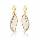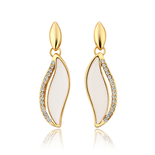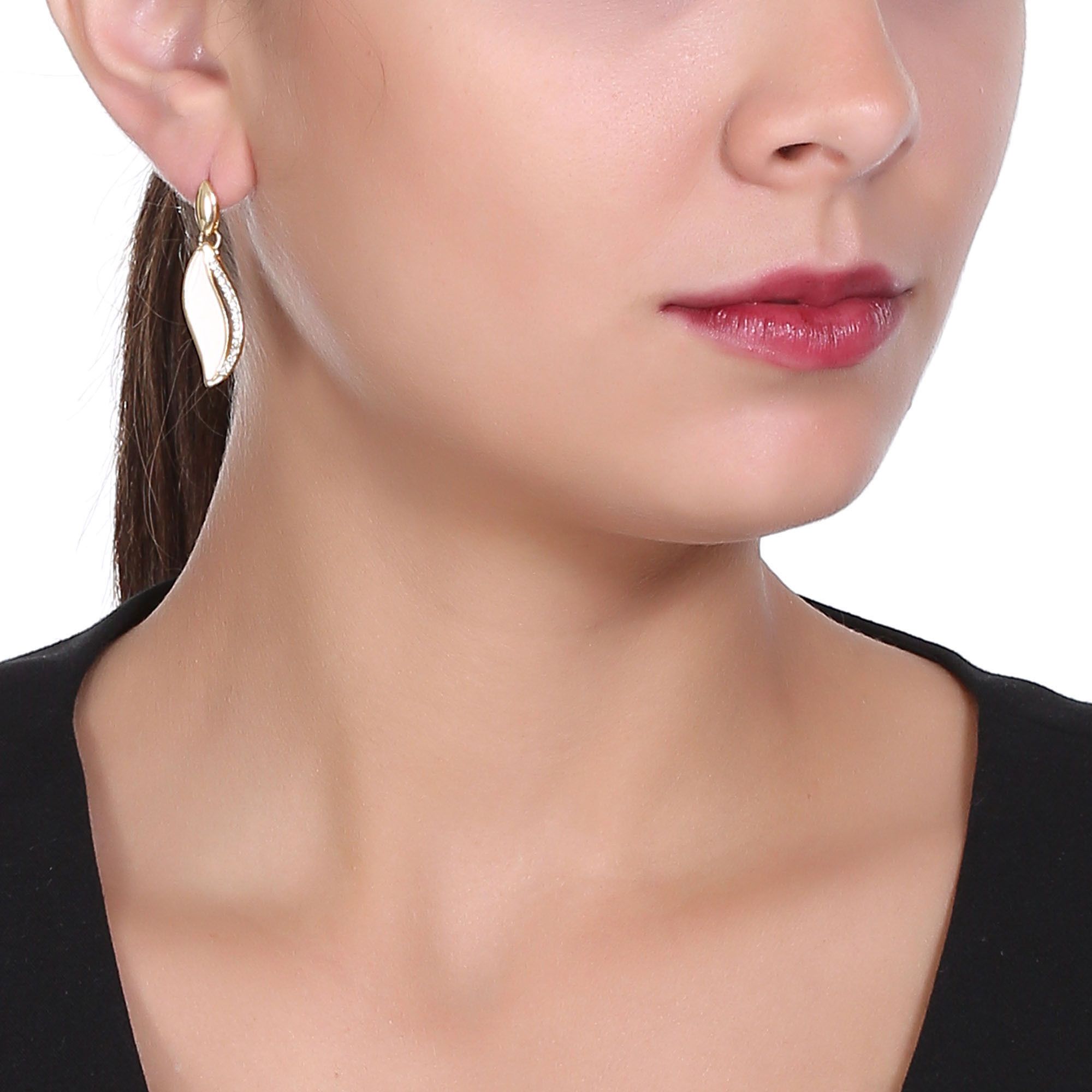 Elegantes aretes, en baño de oro amarillo de 18 quilates, diseño de hoja, con esmaltado color blanco e incrustación de cristales blancos. Fabricado en una estructura de aleación de platino con rodio sin níquel