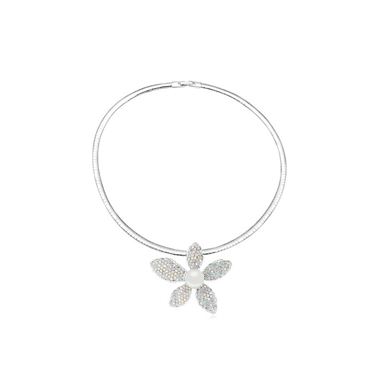 Elegante Collar en baño de oro blanco de 18 quilates, diseño de flor con incrustación de cristales en color blanco, detalle de perla blanca en el centro. Fabricado en una estructura de aleación de platino con rodio sin níquel 1. joyería Hipoalergénica. 2. Incluye cajita de joyería. 3. Garantía de 30 días por defectos de fabrica.