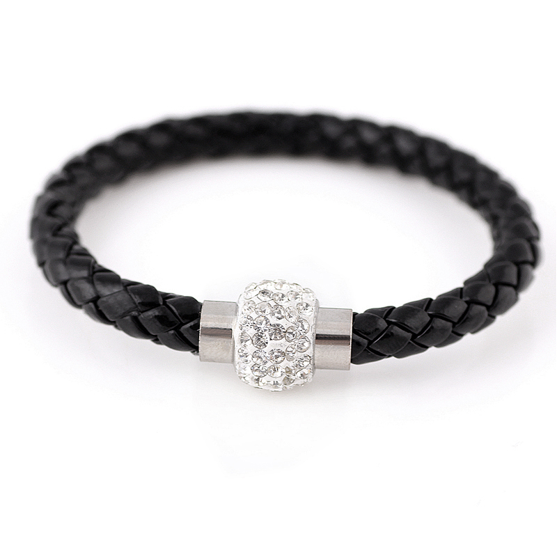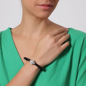 Pulsera con detalles en baño de oro blanco de 18 quilates, original diseño, correa de vinipiel trenzada en color negro y broche magnético con incrustaciones de cristales blancos.