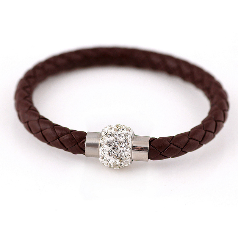 Pulsera con detalles en baño de oro blanco de 18 quilates, original diseño, correa de vinipiel trenzada en color café y broche magnético con incrustaciones de cristales blancos.