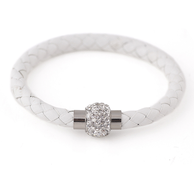 Pulsera con detalles en baño de oro blanco de 18 quilates, original diseño, correa de vinipiel trenzada en color blanco y broche magnético con incrustaciones de cristales blancos.