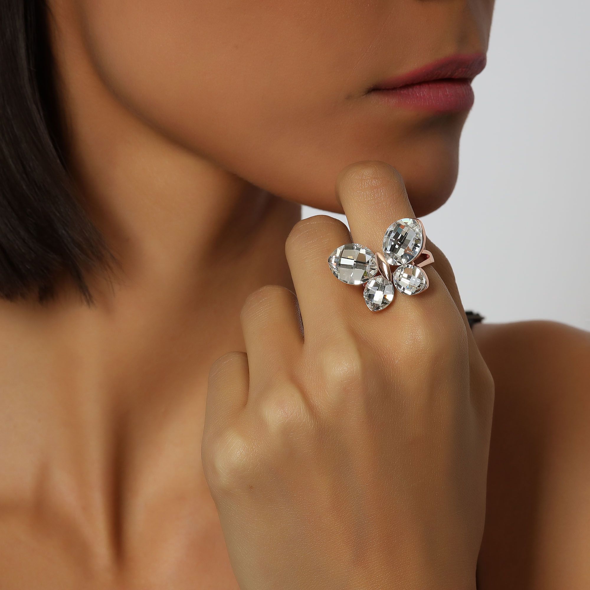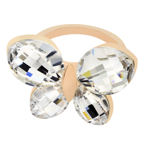 Fino anillo en baño de oro rosa de 18 quilates, diseño de mariposa, con incrustaciones de cristales de en color blanco corte marquesa.