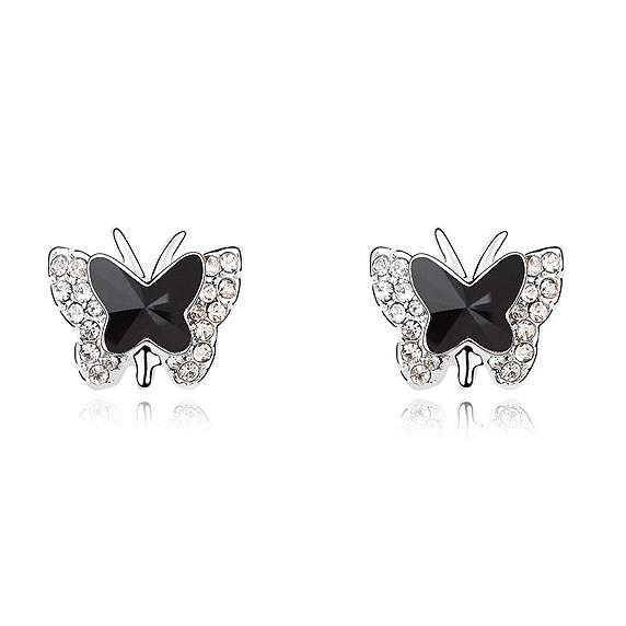 Preciosos aretes, en baño de oro blanco de 18 quilates, diseño de mariposa, en cristal negro e incrustación de cristales color blanco.