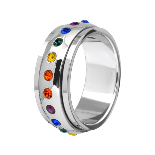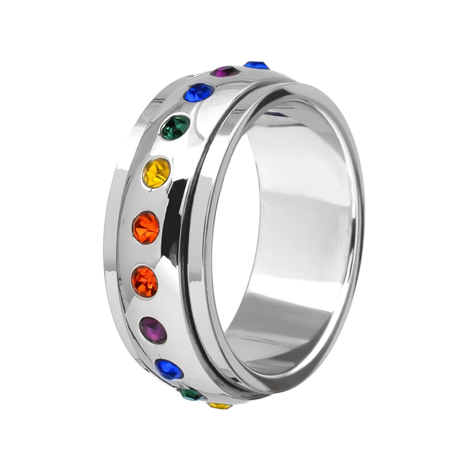 Anillo en acero inoxidable de color blanco, diseño convexo en relieve, con incrustaciones de cristales en color rojo, naranja, amarillo, verde, azul y morado.
