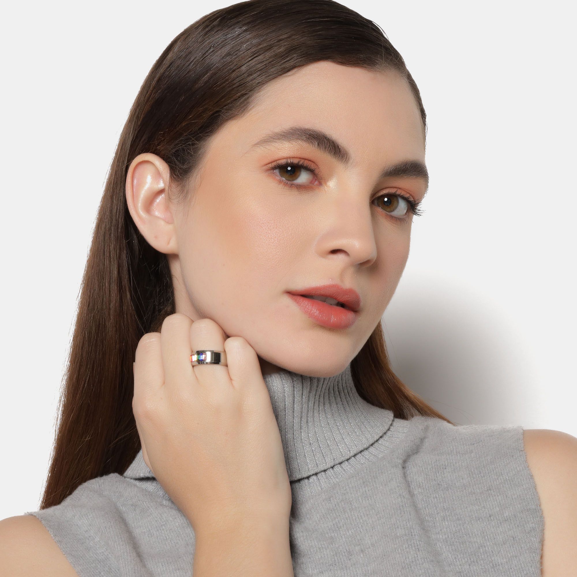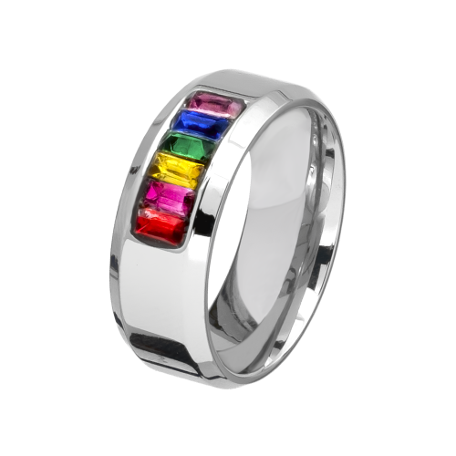 Anillo en acero inoxidable de color blanco, original diseño, con incrustaciones de cristales corte baguette, en color rojo, rosa, amarillo, verde, azul y morado.