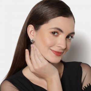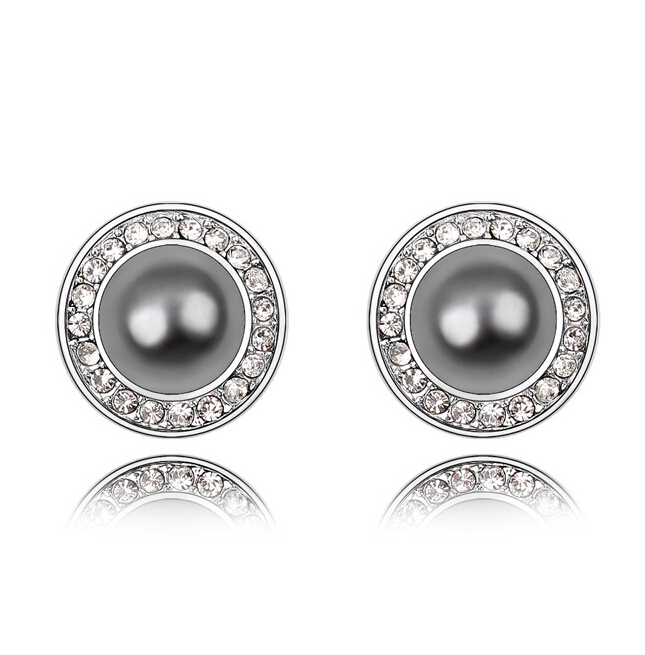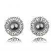 Elegantes aretes, en baño de oro blanco de 18 quilates, diseño de círculo, con perla gris oxford e incrustación de cristales en color blanco. Fabricado en una estructura de aleación de platino con rodio sin níquel.