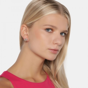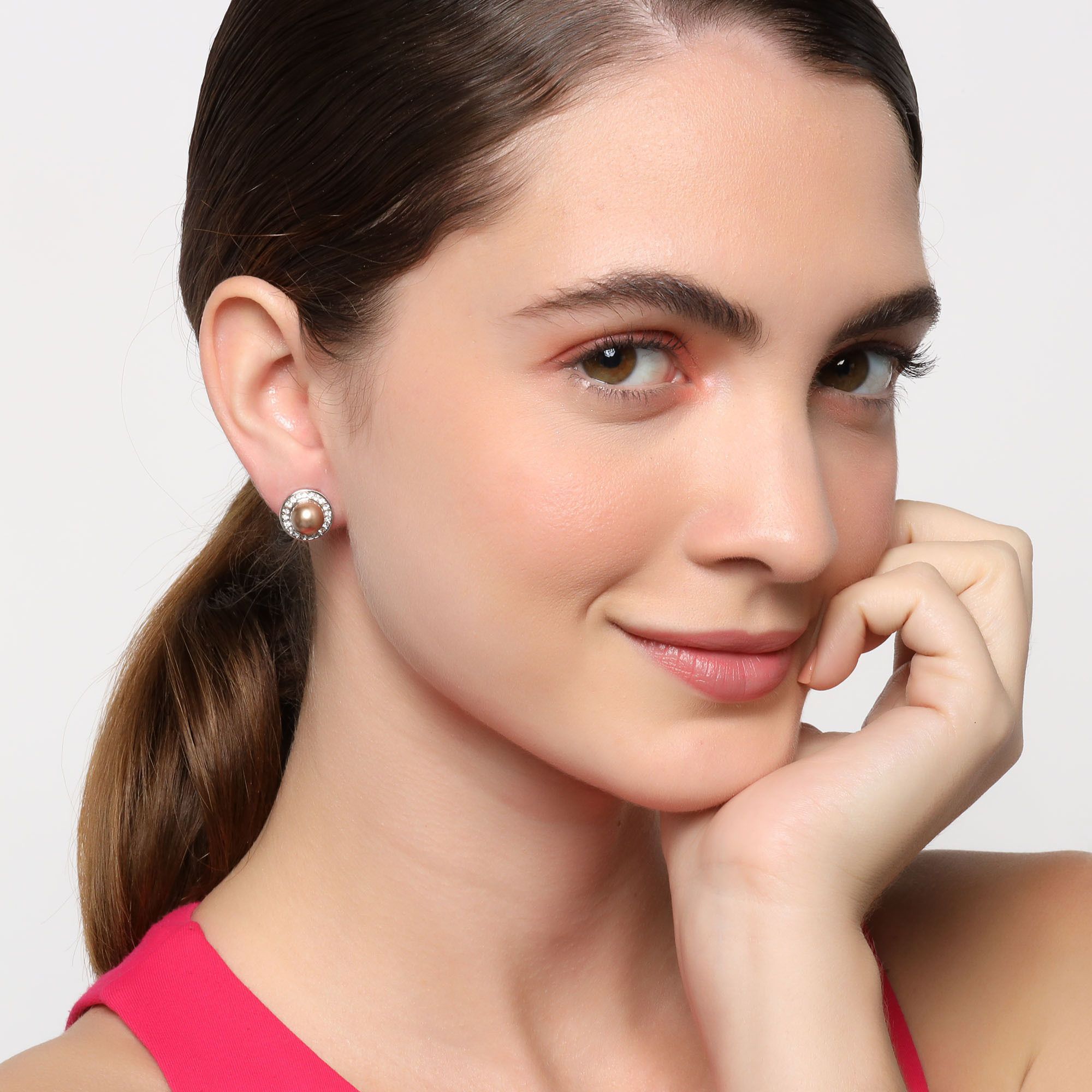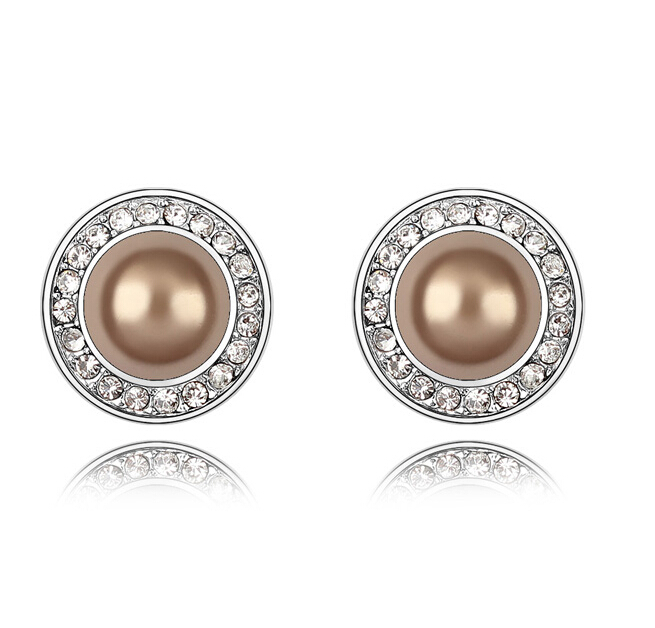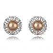 Elegantes aretes, en baño de oro blanco de 18 quilates, diseño de círculo, con perla dorada e incrustación de cristales en color blanco.
